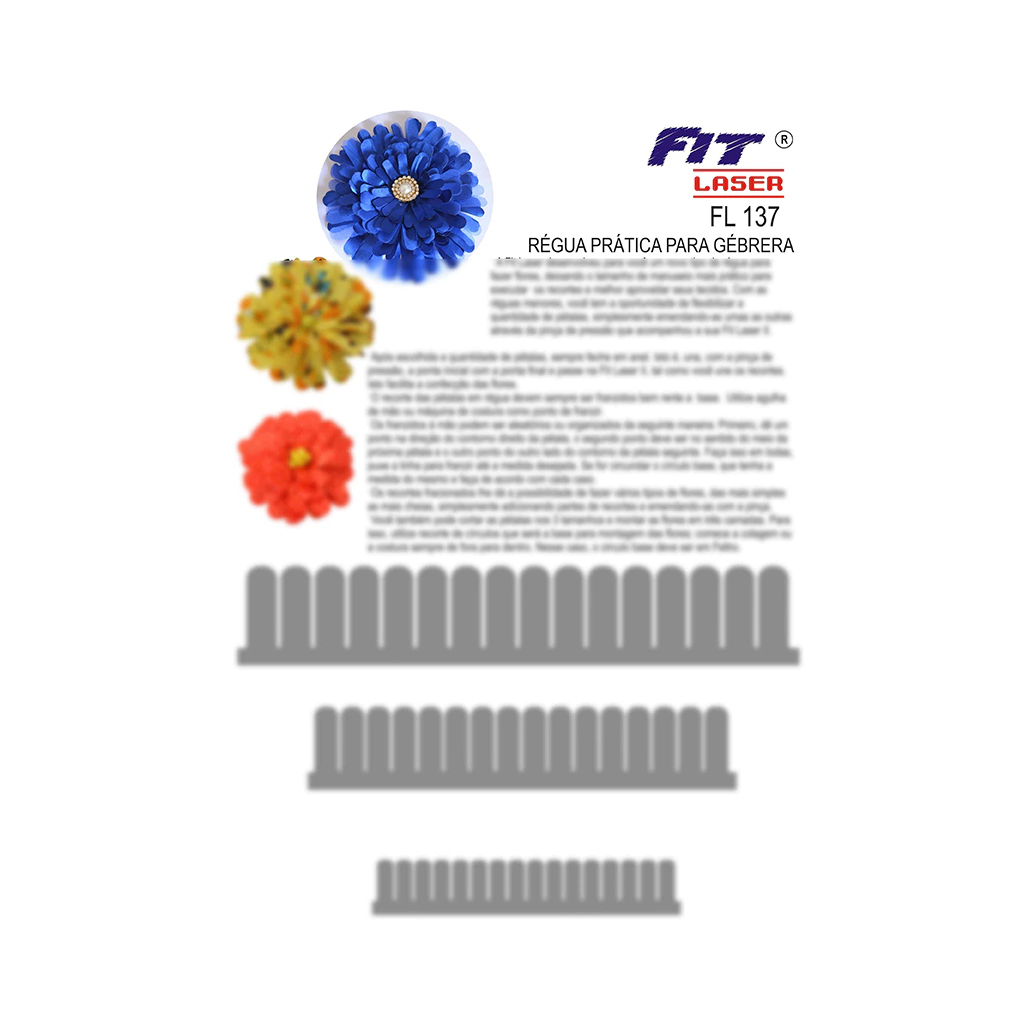 A cartela FL 137 é perfeito para você criar lindas flores de pétalas finas, como gérberas ou margaridas, utilizando a Fit Laser. Com as réguas inclusas, você pode fazer 3 tamanhos diferentes de flores, sendo que a régua menor foi especialmente projetada para facilitar o corte e economizar tecido.
