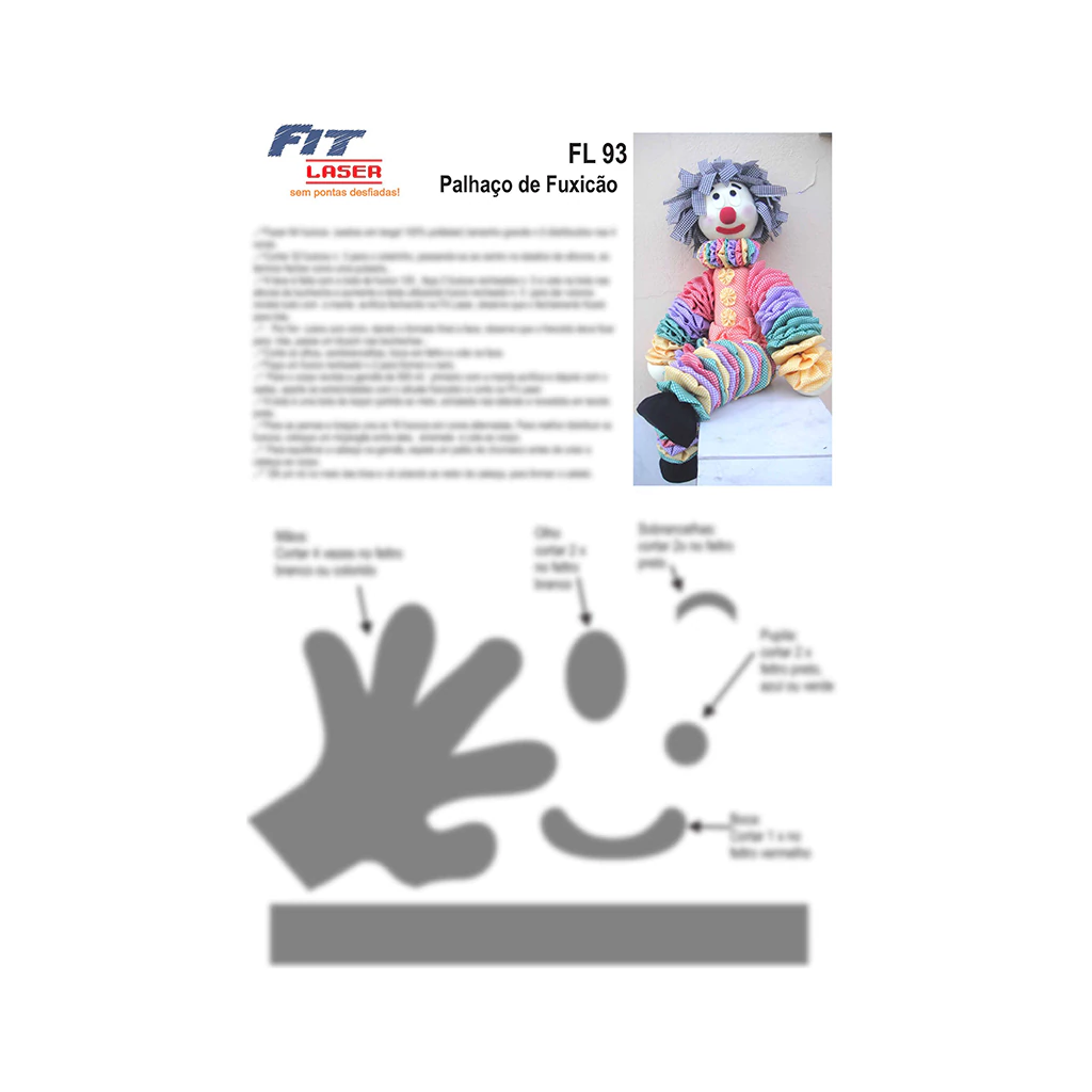 Os moldes são projetados especificamente para a criação do palhaço de fuxico e incluem as formas para as mãos, expressão do rosto, cabelo e mãos. O corpo e os membros do palhaço serão feitos de fuxicos número 5, portanto, é necessário possuir A cartela Fuxico da Fit Laser para completar o projeto.