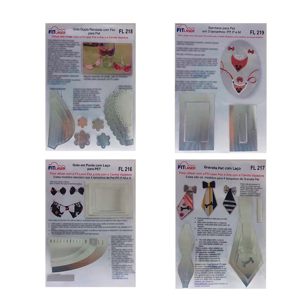 O Kit Pet Shop é perfeito para quem deseja criar lindos acessórios para cães de forma fácil e prática. Composto por uma seleção de cartelas de moldes em alumínio, finamente acabados, você poderá cortar as fitas de cetim e gorgurão sem desfiados, utilizando a máquina Fit Laser Flor e Arte.
