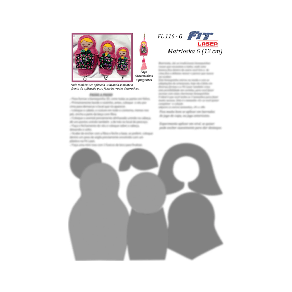Confeccione lindas e charmosas Bonecas Russas Matrioscas com o conjunto FL 116 G. Este conjunto contém todas as peças de moldes necessárias para criar a sua própria boneca Matriosca. Os moldes são feitos em alumínio de alta qualidade, com um acabamento fino que permite cortar o feltro sem desfiar.
